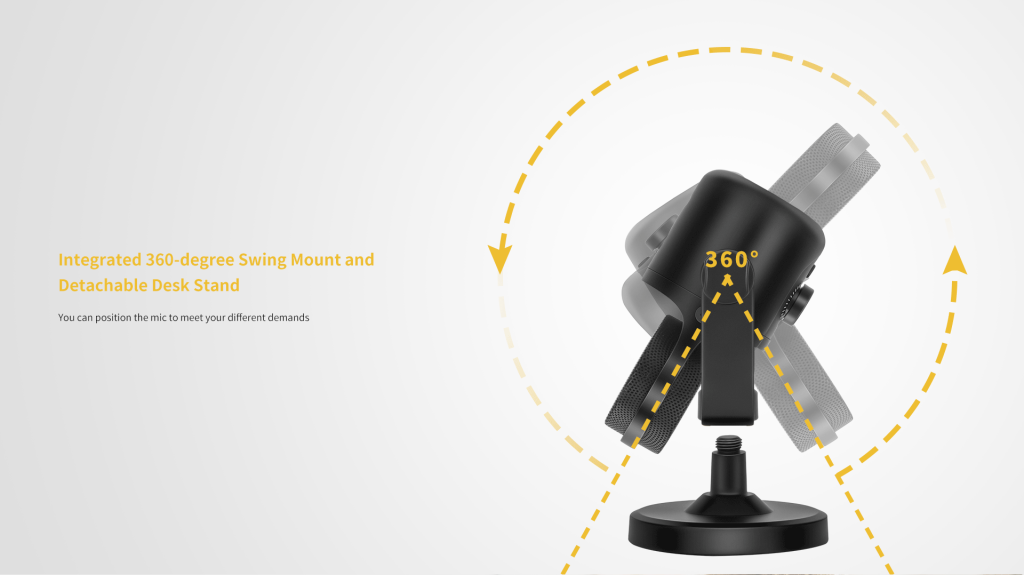 Versatility meets convenience with the integrated 360-degree swing mount and detachable desk stand, offering flexible positioning options to suit your recording setup, whether it’s on a desk, boom arm, or microphone stand.>