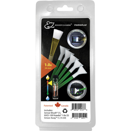 The EZ Sensor Cleaning Kit PLUS with Smear Away, 5 Green 1.0x Vswabs and Sensor Brush from Visible Dust contains a 1.15ml bottle of Smear Away liquid cleaner, 5 green 1.0x Vswabs and one sensor brush. Smear Away is designed to clean the hardest lubricant or oil stains. It removes the smear on the first swipe and has strong anti-fog and anti-static capabilities. An anti-scratch component prevents contaminants from scratching the sensor while cleaning. This very strong liquid cleaner removes pollen and the toughest sensor stains, it is non-flammable and non-alcoholic.